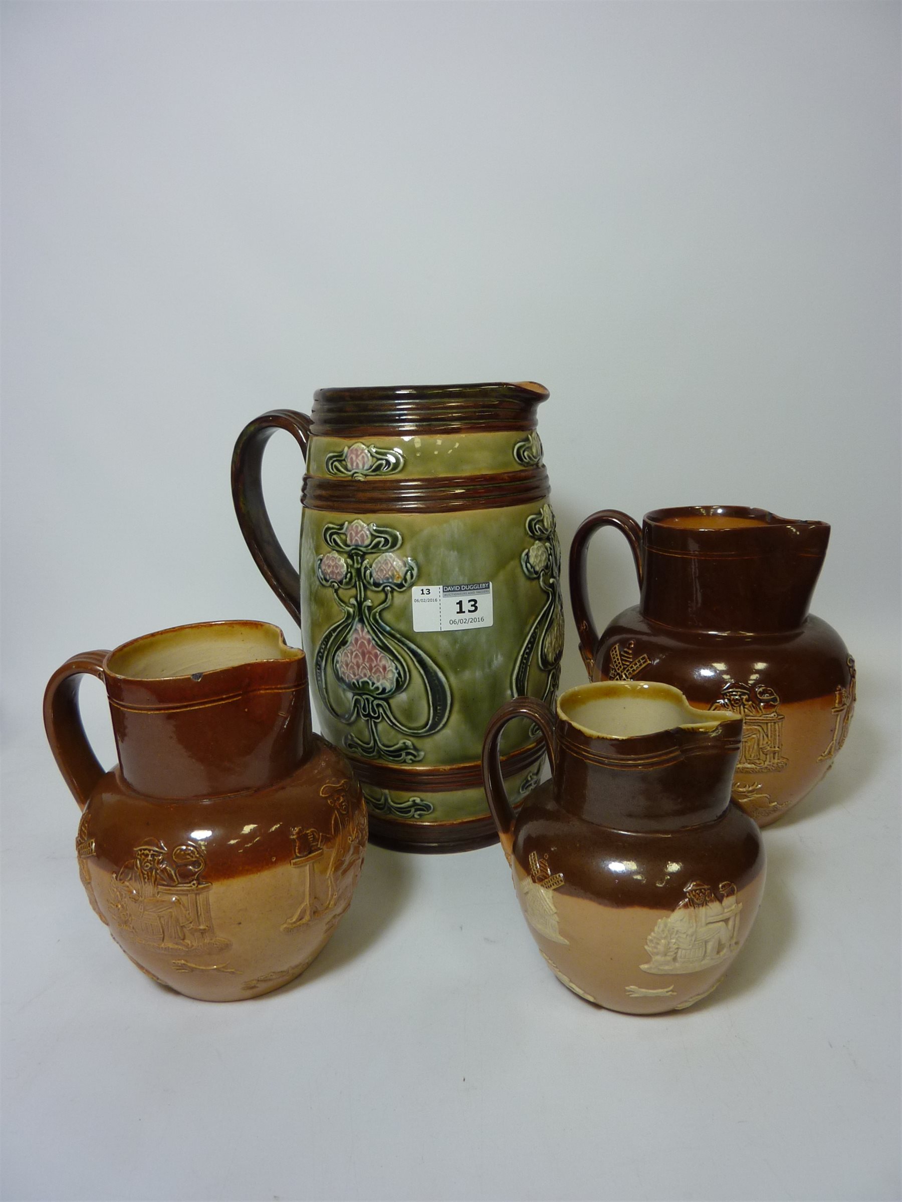 Large Royal Doulton Art Nouveau design jug H23.5cm and three Doulton salt glaze jugs (4)