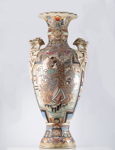 baluster shape with dragon fixed ring handles, painted in colours, 81cm