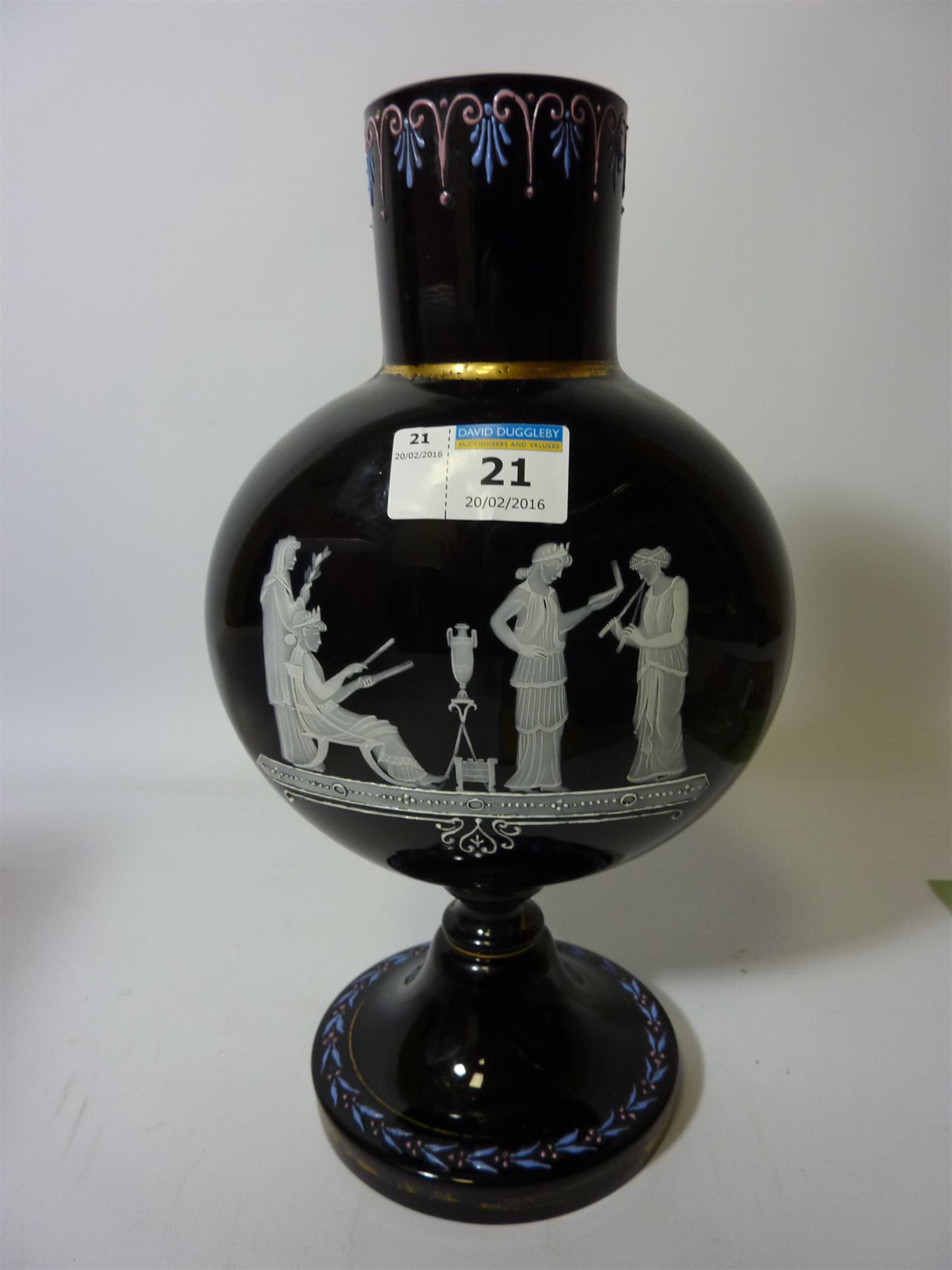 Late 19th century black glass vase, the translucent enamel decoration depicting the Four Muses
