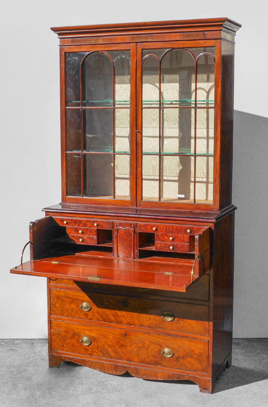 Top with stepped pediment, 2 glass doors with arched fretwork, patterned silk back, 2 glass shelves. Highly grained drawer fronts and compartmented drop front secretary interior with drawers, door and open shelves