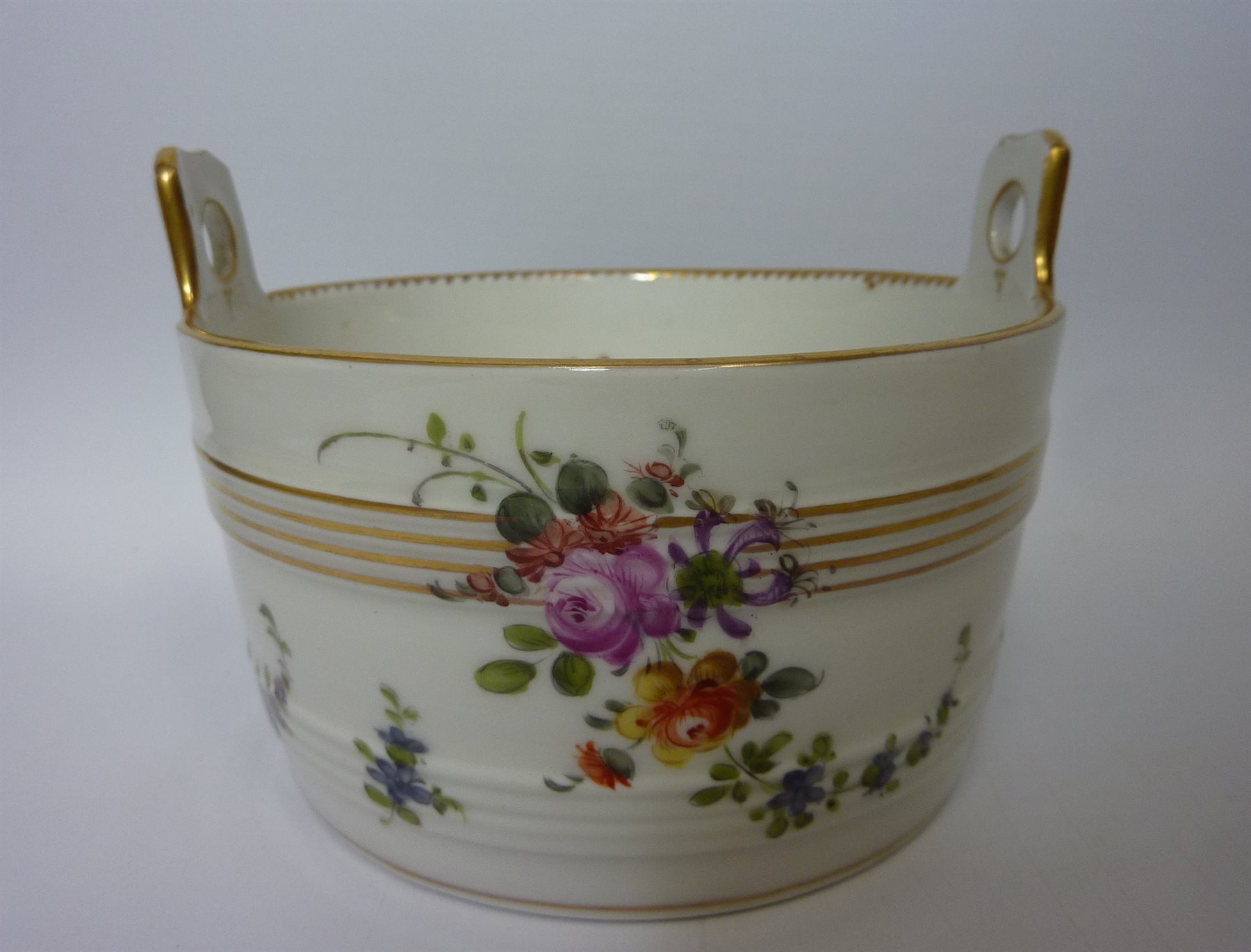 Late 19th/early 20th century porcelain basket with floral decoration, Dresden type marks to base H11cm