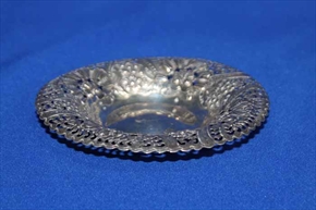 maker Martin, Hall & Co, Sheffield 1893, embossed and pierced with scrolling design, fluted rim, approximately 83g, 14cm in diameter