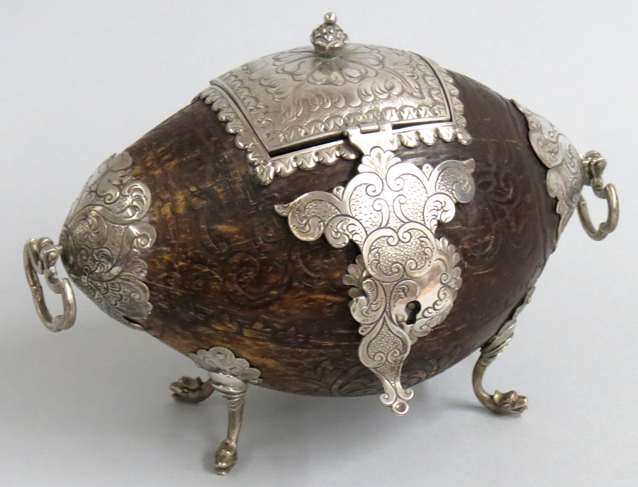 the nut with overall scrolling leaf and floral carving, silver mounts incl. scrolled latch, lid, escutcheon, side mounts with drop swing handles, silver legs ending with serpent head, original key, 6"h incl. finial; 8"w These boxes, called yerbera,