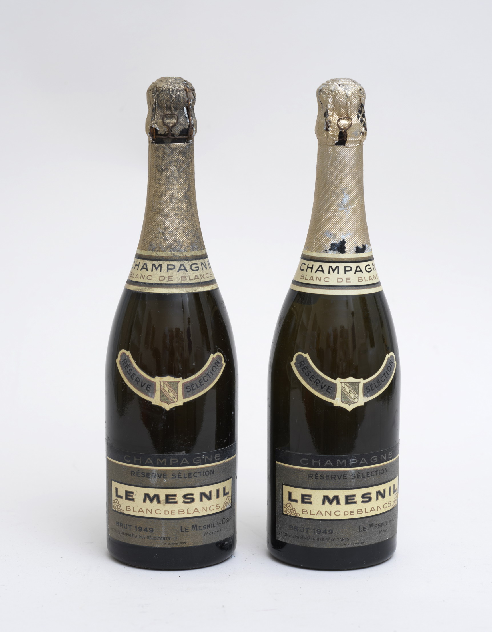 2 bottles CHAMPAGNE LE MESNIL 1949 Blanc de blancs (levels under the collars, faded labels, very marked, scratched)