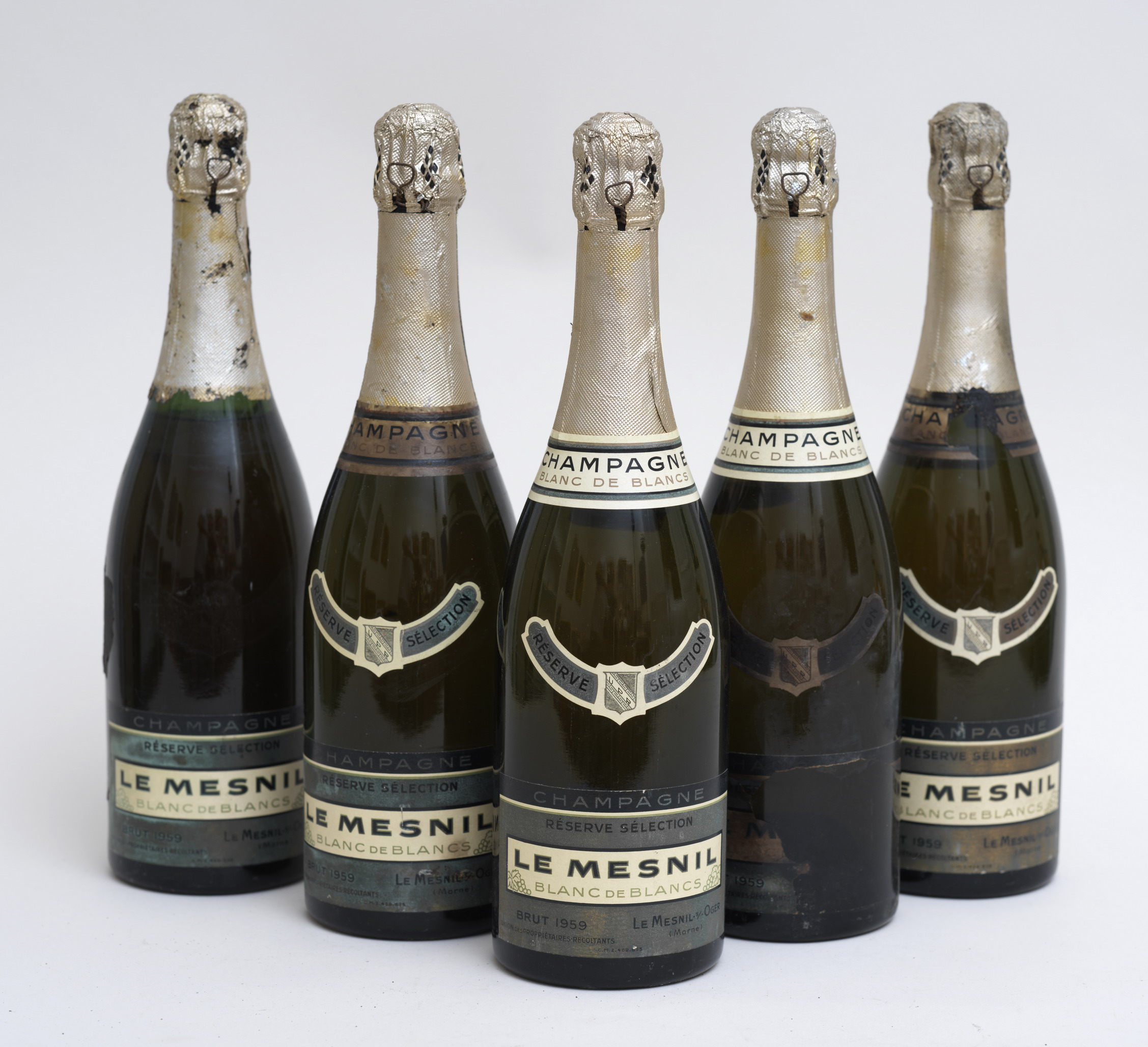 5 bottles CHAMPAGNE LE MESNIL 1959 Blanc de blancs (levels under the collars, faded labels, lightly scratched)