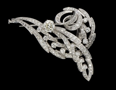 Leaf shaped brooch set with a diamond (approx 1.5 ct) and paved with diamonds (approx 1.5 ct)