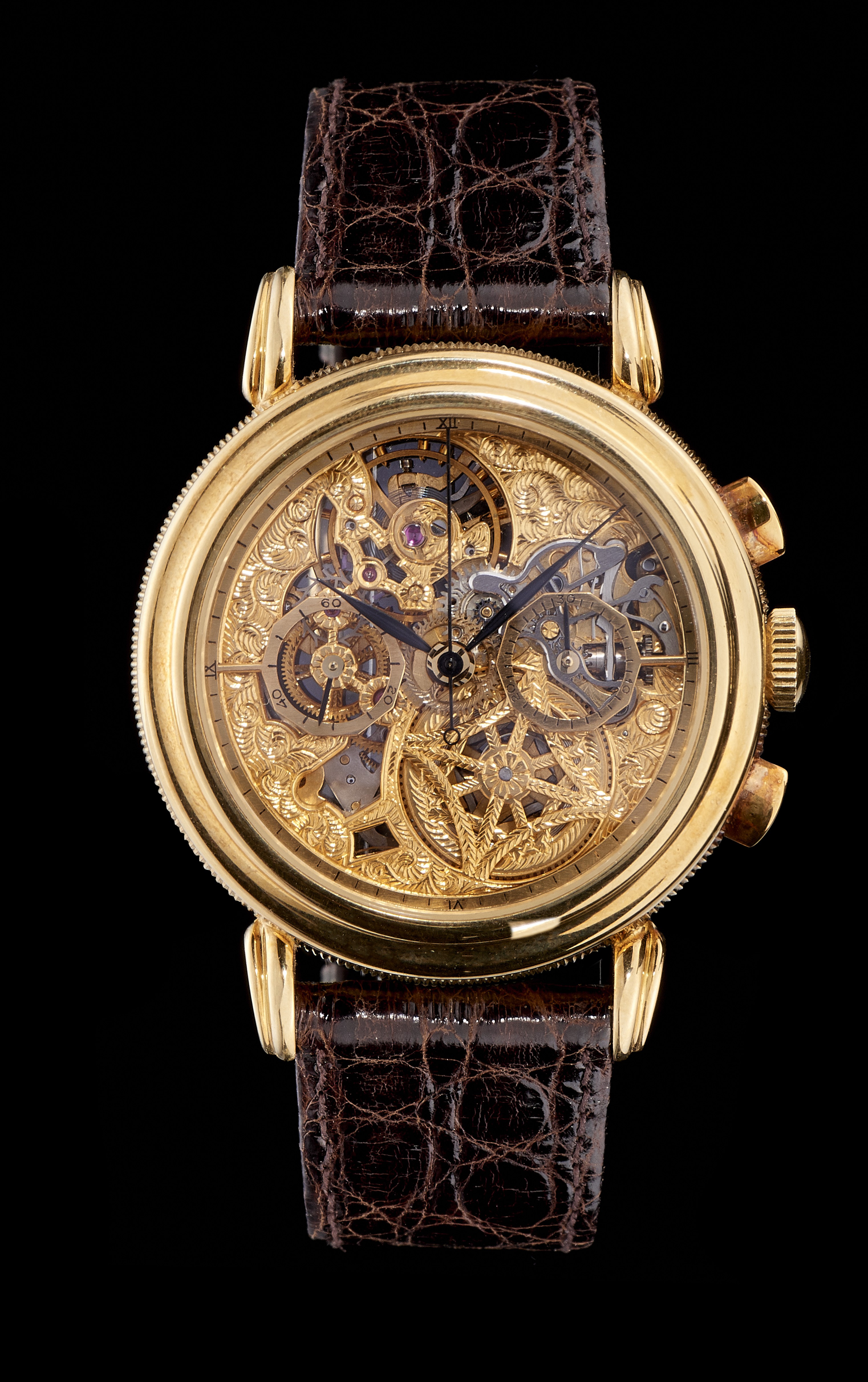 Openwork dial and guilloché, black hands, seconds at 9 o'clock, probably 30 years, 750 gold, D 36 mm, gross weight 54 g