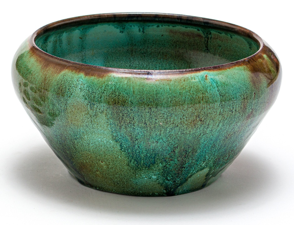 the moulded exterior raised on an iridescent glazed foot and base, firing faults, impressed dish mark and painted Linn Ware, 23cm diameter