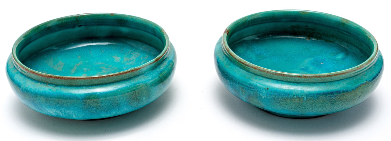 circular, each compressed body glazed in shades of green with brown highlights, impressed dish mark, 14,5cm diameter