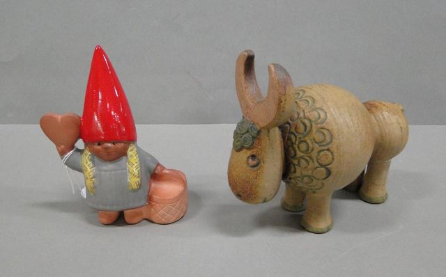 Lisa Larson Gustavsberg, Buffel ur serien Jura, H15cm, ett ben lagat samt nisse med ljusstake H15cm