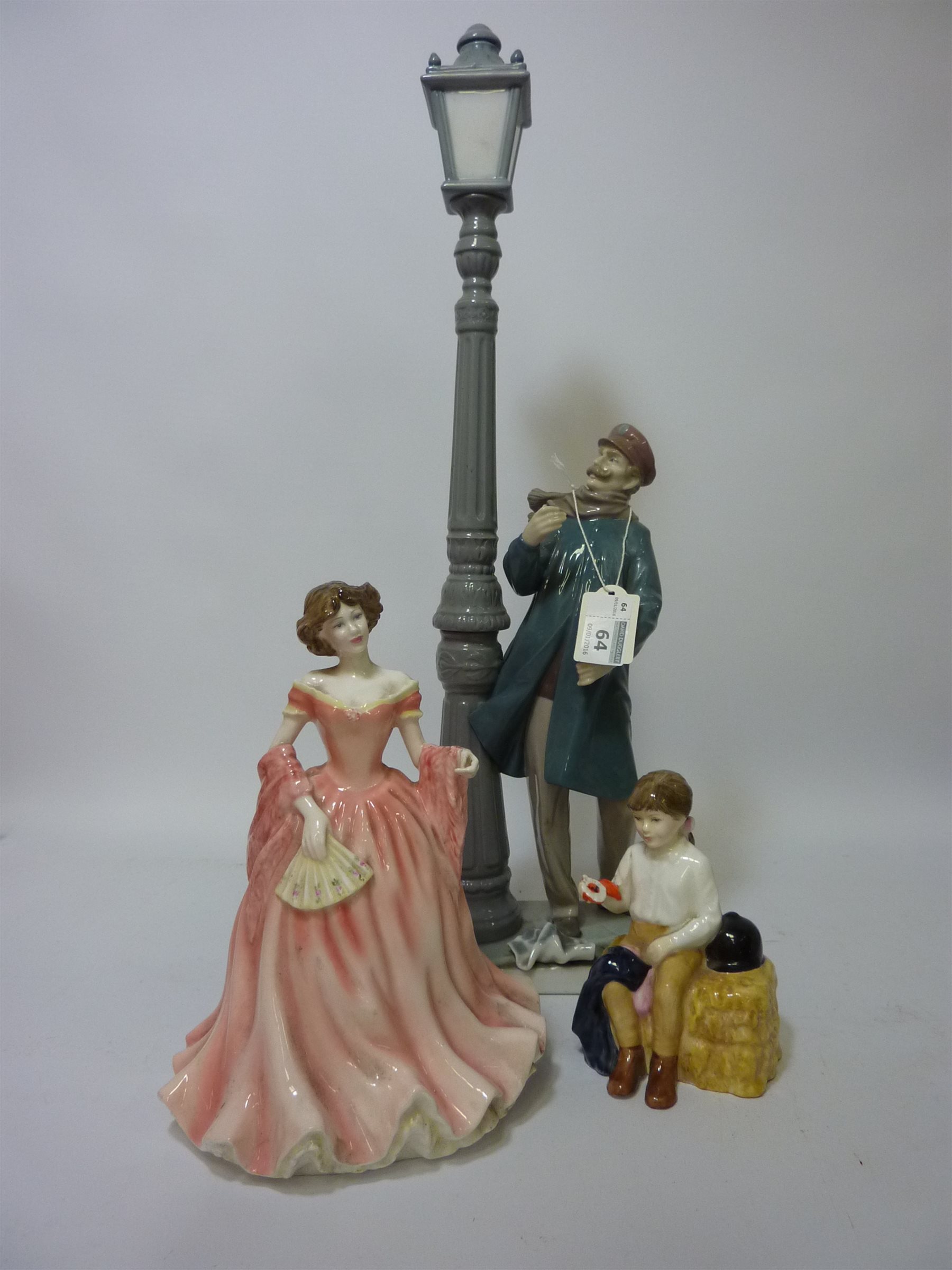 Lladro figure of a lamplighter, Royal Doulton figurines 'Ruth' HN4099 and 'First Prize' HN3911 (3)