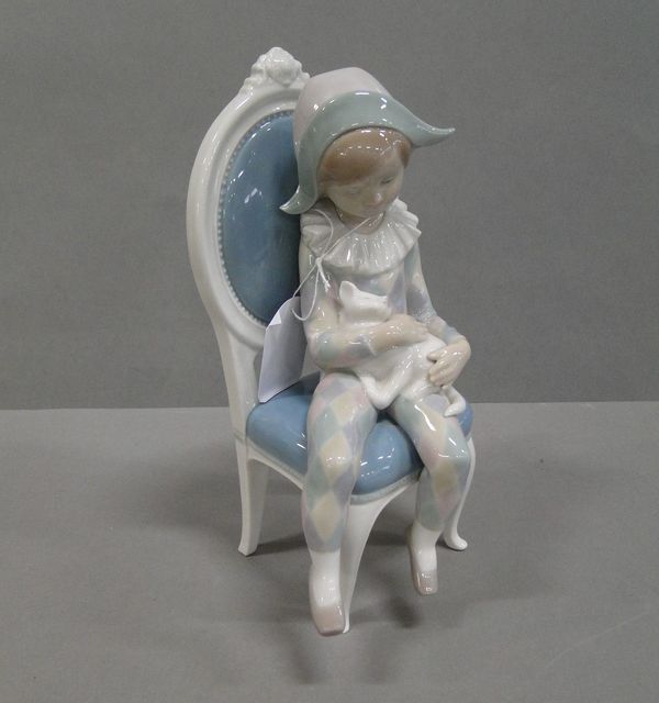 Lladro figurin, sittande clown med hund på stol, H26cm