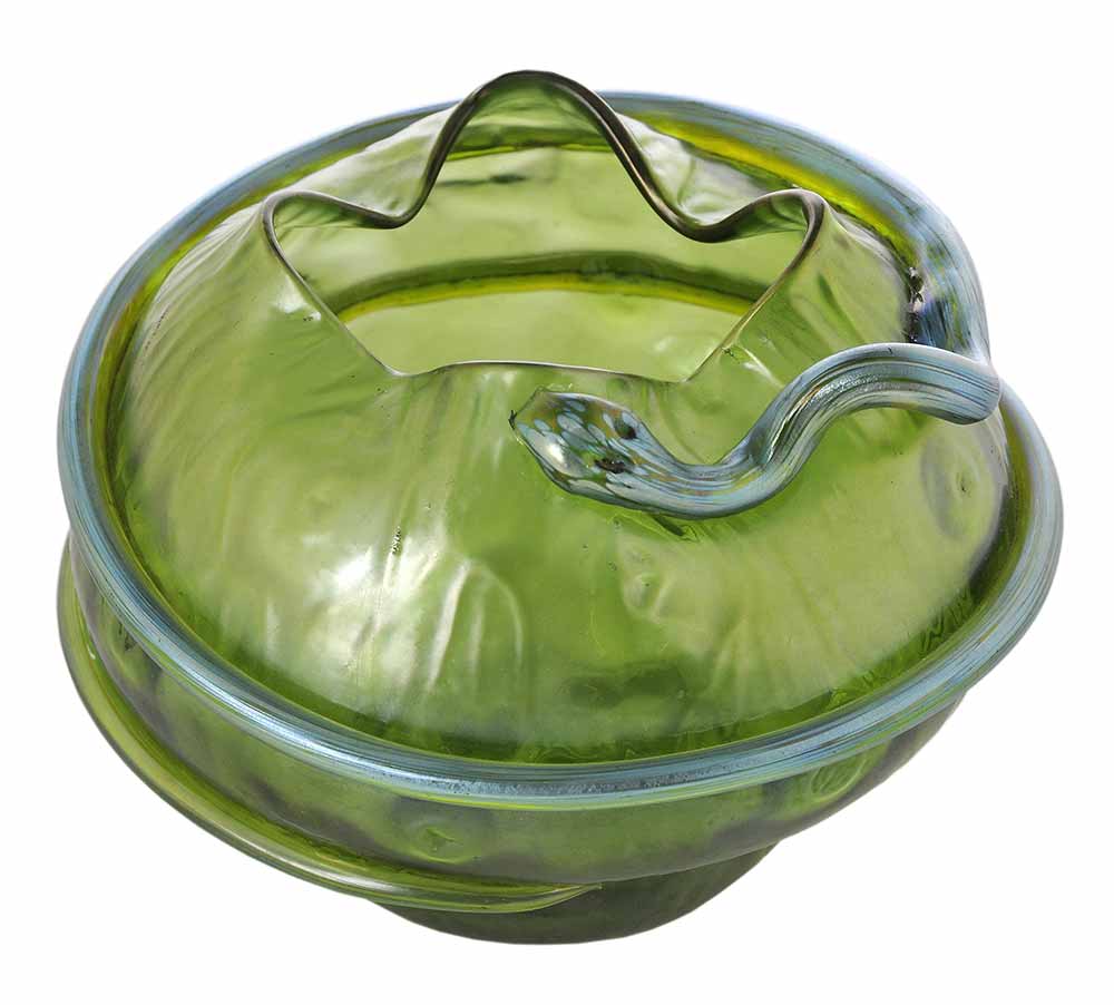 Austria, late 19th/early 20th century, green glass with iridescent green surface and blue iridescent snake, unmarked, 5 in.,
