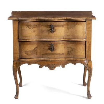 Baroque style Lombard chest of drawers with 2 drawers and carved arched legs. Walnut veneer.