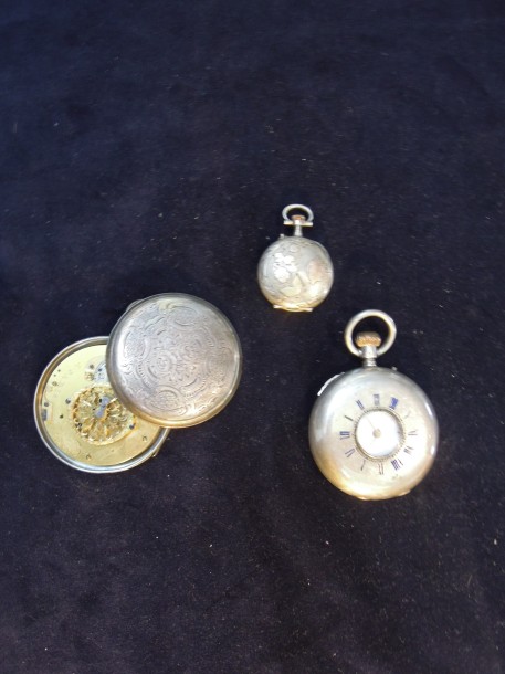Set of 6 silver or steel watches -A small enamelled blue golden silver, punch swan, weight Brut: 19 gr, Accidents and misses - A silver, minerva punch 2nd title (800/1000). Gross Weight: 91 gr, Accidents and missing - A silver, crab punch (800/100
