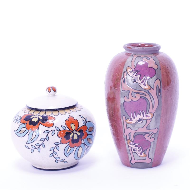 Lot of 2 American Satsuma pieces. Handpainted floral vase & gilt floral lidded canister jar