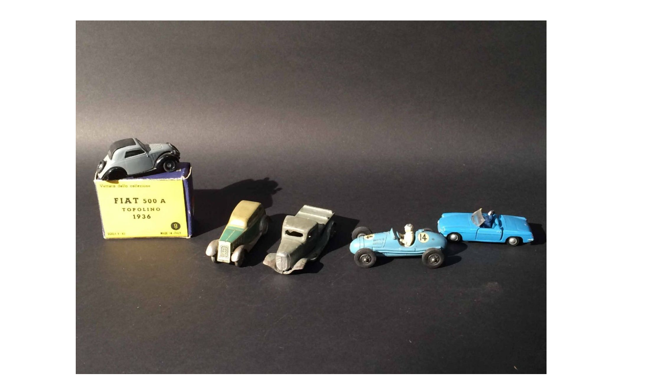 Lot of 5 cars: Fiat 500 A, Topolini 1936 in its box, 2 car sheet metal lithographed, The Crescent Toy Co, Gordini 2.5 l, MGB