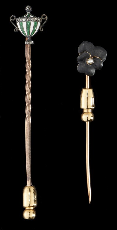 Lot of two enamel pins, one decorated with an urn and the other with a flower