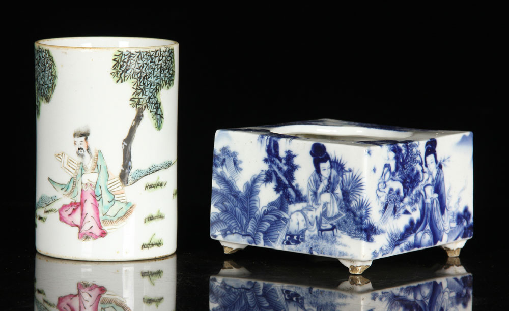 to include: one blue and white brush pot, 2 3/4" h x 4 1/8" dia; and one famille-rose brush pot, 4 5/8" h