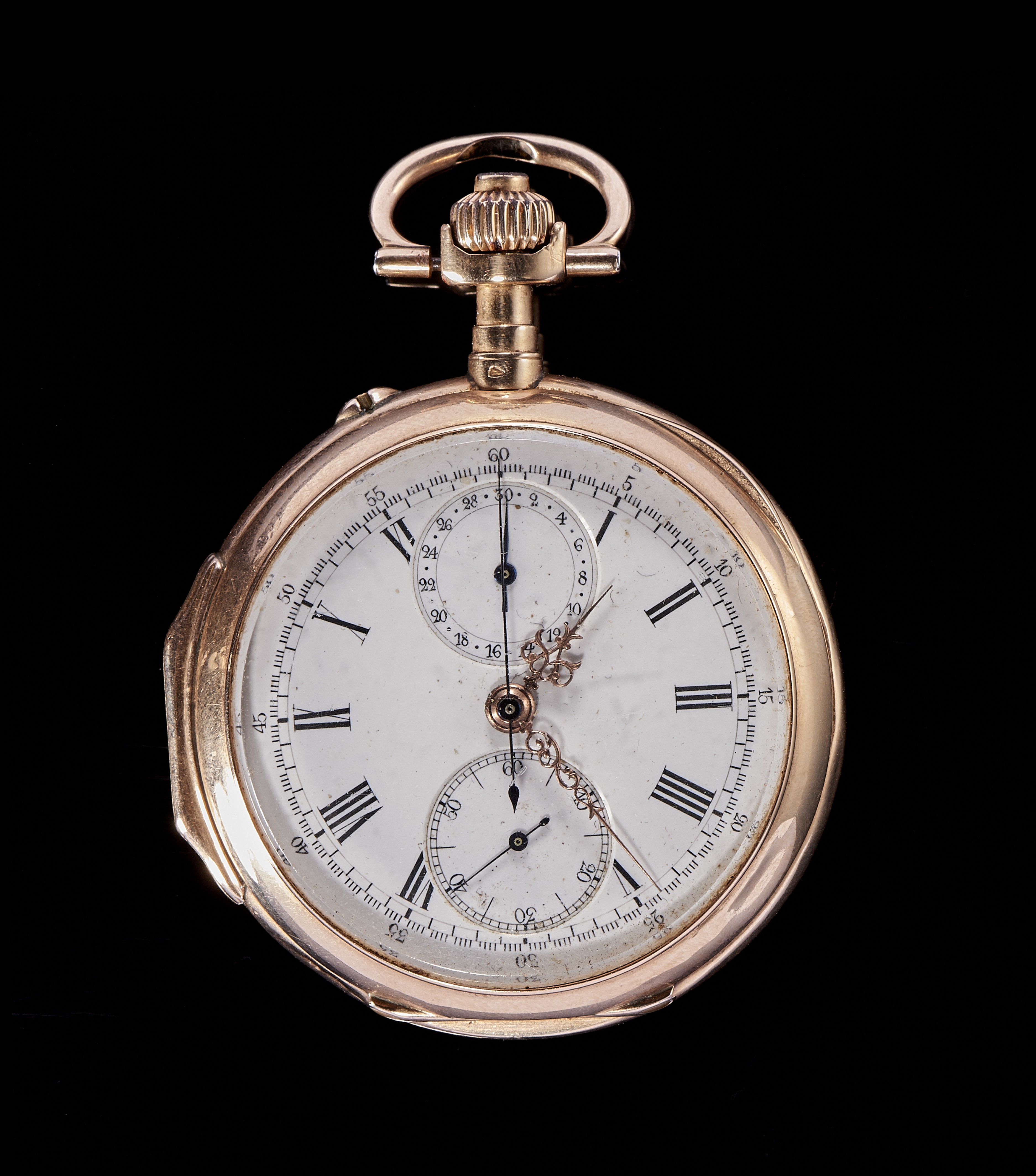 White dial, gold hands, black Roman numerals, seconds at 6 o'clock, monopusher chronograph, 750 gold, D 49 mm, gross weight 97 g