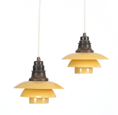 A pair pendants with brown bakelite sockethouse, yellow/frosted glasss shades