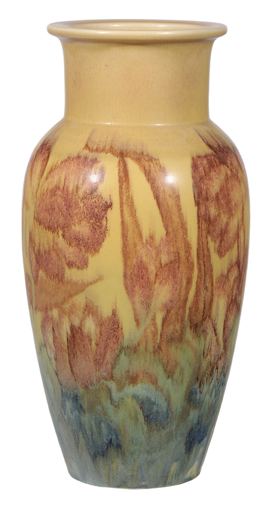 flowers and leaves on yellow matte ground, unglazed base with impressed Rookwood mark and Roman numeral date "XXVII", impressed shape number "324" and artist's cipher for Louise Abel, 17-1.8 in.