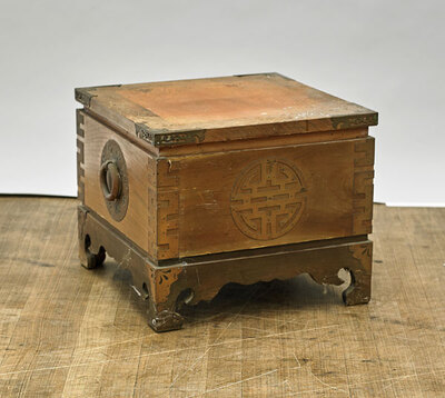 Low antique Korean wood storage chest; of square form; the sides showing metal accents, pending loose rings; 14 1/2