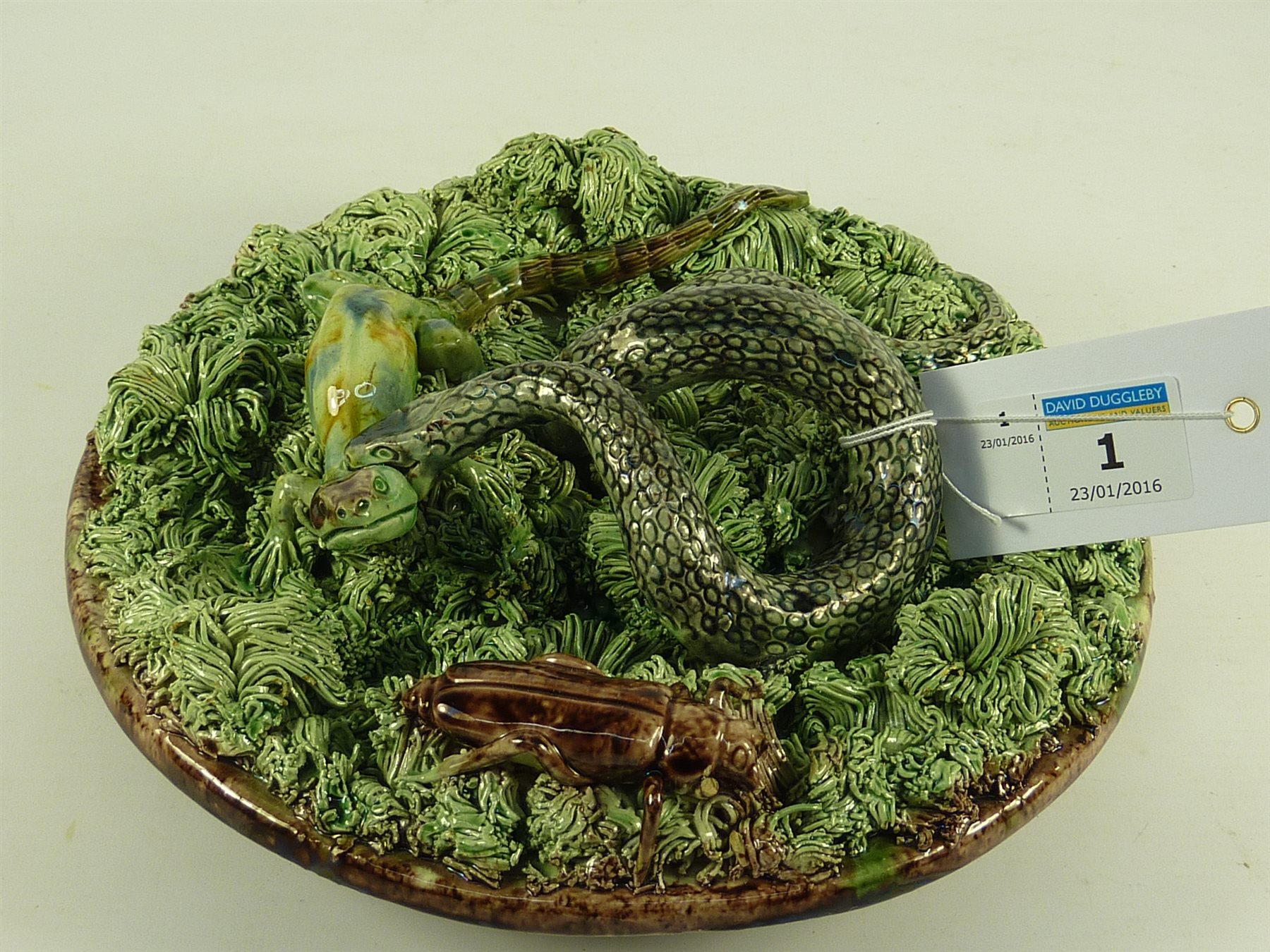 M. Mafra Caldas Portuguese Palissy Ware plate decorated with a snake, lizard and a beetle
