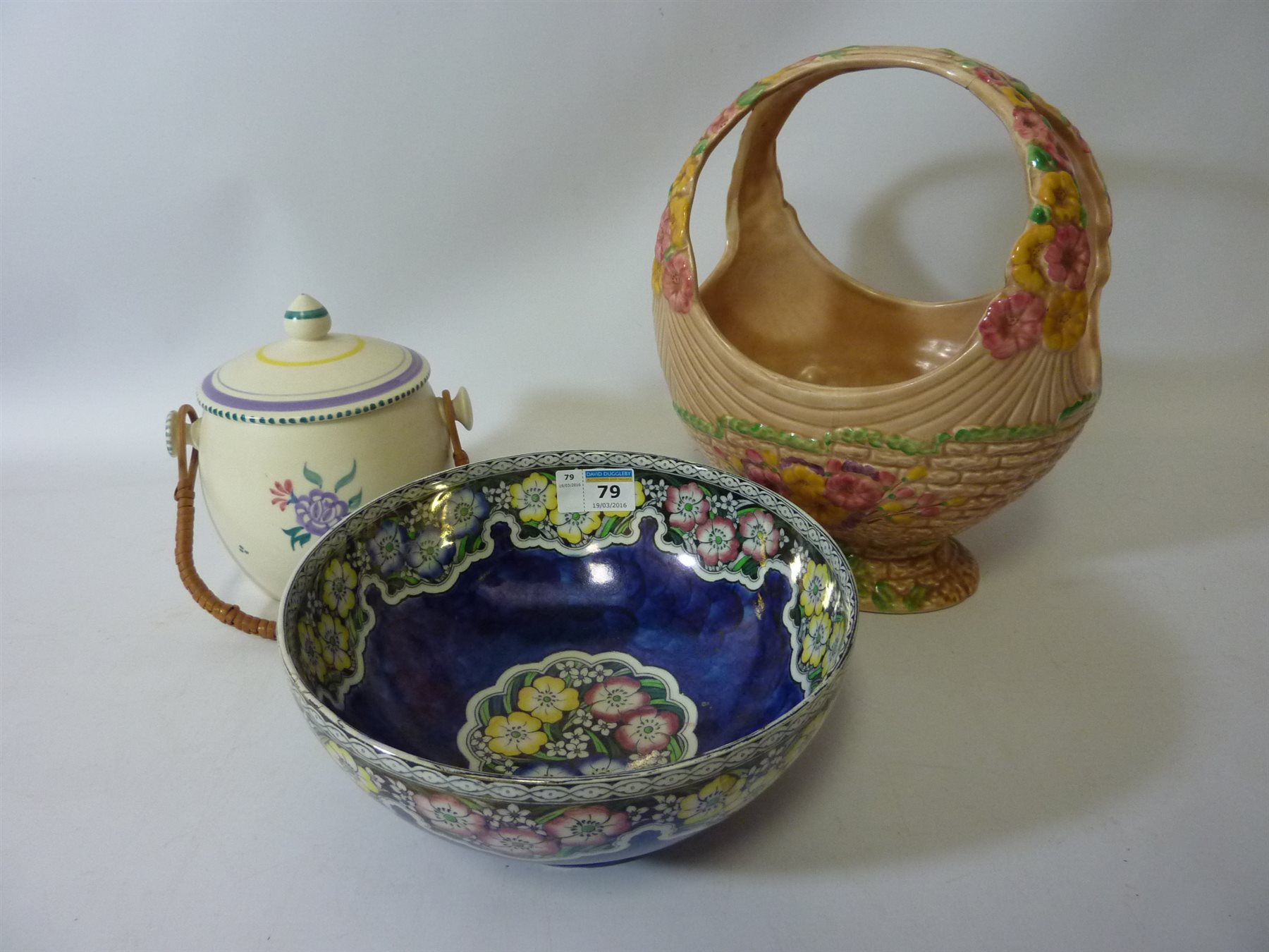 Maling bowl D21.5cm, Poole biscuit barrel and an Arthur Wood basket shape vase