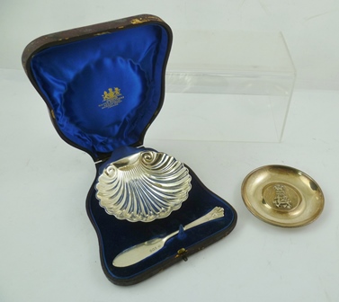 MAPPIN BROTHERS A VICTORIAN SHELL PATTERN PRESSED SILVER BUTTER DISH, on three ball feet, and a MATCHING BUTTER KNIFE, Sheffield 1894, in original packing case, and a SILVER ASHTRAY commemorating the Prince of Wales Investiture 1969, total 162g.