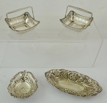 MARPLES & CO A PAIR OF FANCY SQUARE SILVER BONBON BASKETS each having pressed bead rim and fretted decoration, and two other odd SILVER NUT DISHES, mixed assays, 189g