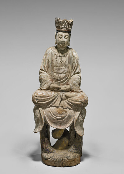 Massive Chinese carved wood figure of Guanyin; seated with hands in dhyana mudra atop a tall pedestal above a fish; adorned in flowing robes and ornate crown showing seated Buddha figures; with some pigment remaining; 17th-18th Century; H: 48" (appro