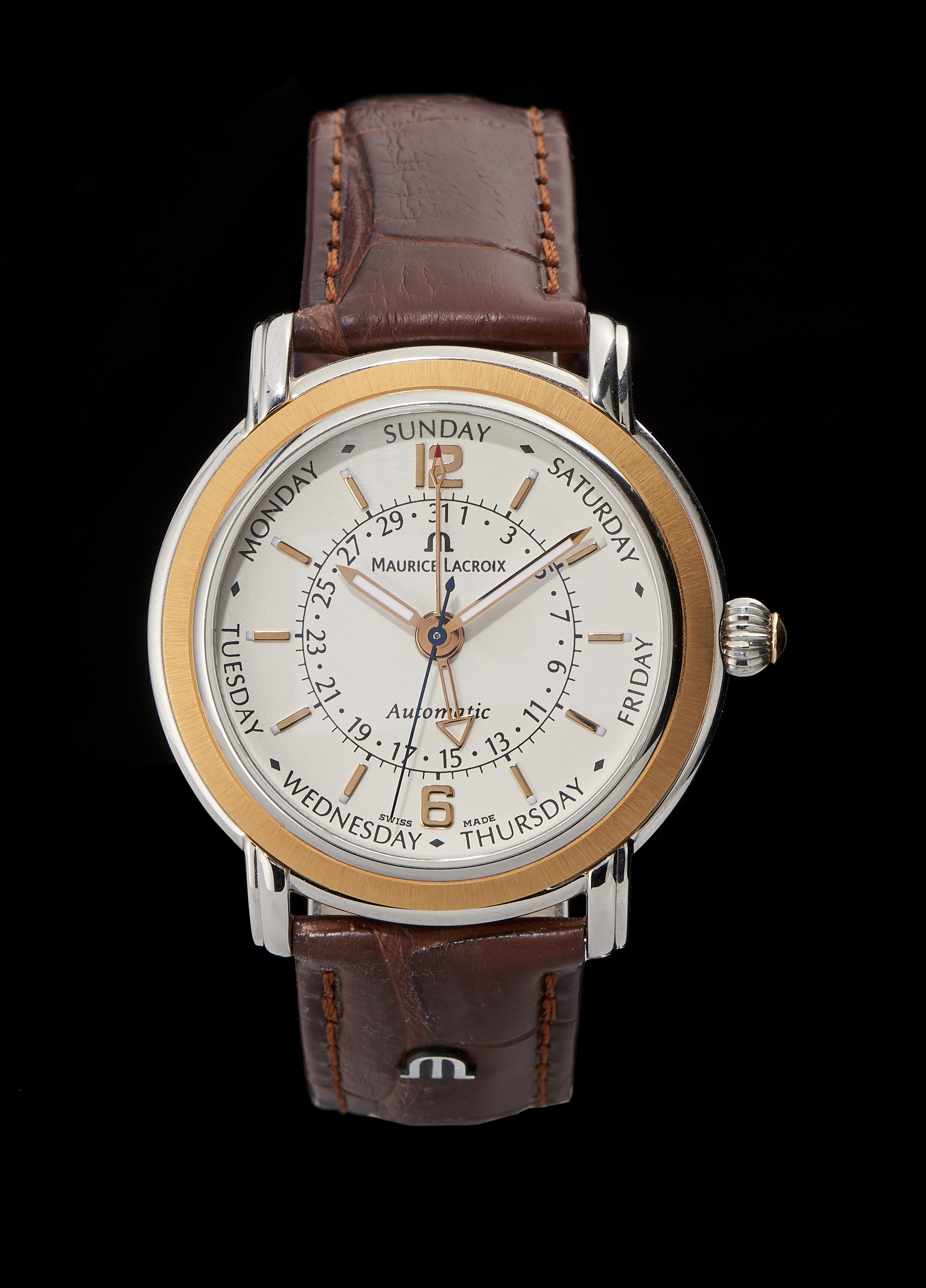 Silver dial, Arabic numerals, baton indexes and golden hands, date and day indication, ref. 27857, rose gold 750 and steel, 39 mm, with its certificate of authenticity