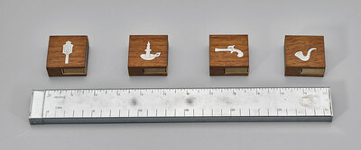 Mid-Century accessories: "The Foot Rule" table/desk lighter by Dunhill, the chromed plated piece in the shape of a ruler, with 12 inches to one side and 30 centimeters to the other, stamped Made In West Germany; together with set of four teak matchbo