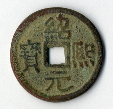 Dynastie Sung (960 – 1279), Jižní Sung (1127 – 1279), hodnota 5, revers 4 (zkušební ražba). Průměr 3,5 cm, 14,73 g