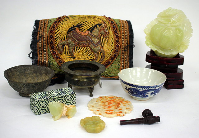 MISCELLANEOUS ORIENTAL ITEMS to include a jade type hardstone mystical beast, a blue and white pottery bowl and further items
