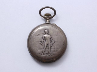 Montre de poche en argent 800 millièmes, cadran émaillé blanc signé DOXA avec chiffres arabes. Dos de boîte sculpté représentant un archer sur fond de croix helvétique. Mouvement mécanique, échappement à ancre, signé LeCoultre & Cie. Travail suisse v
