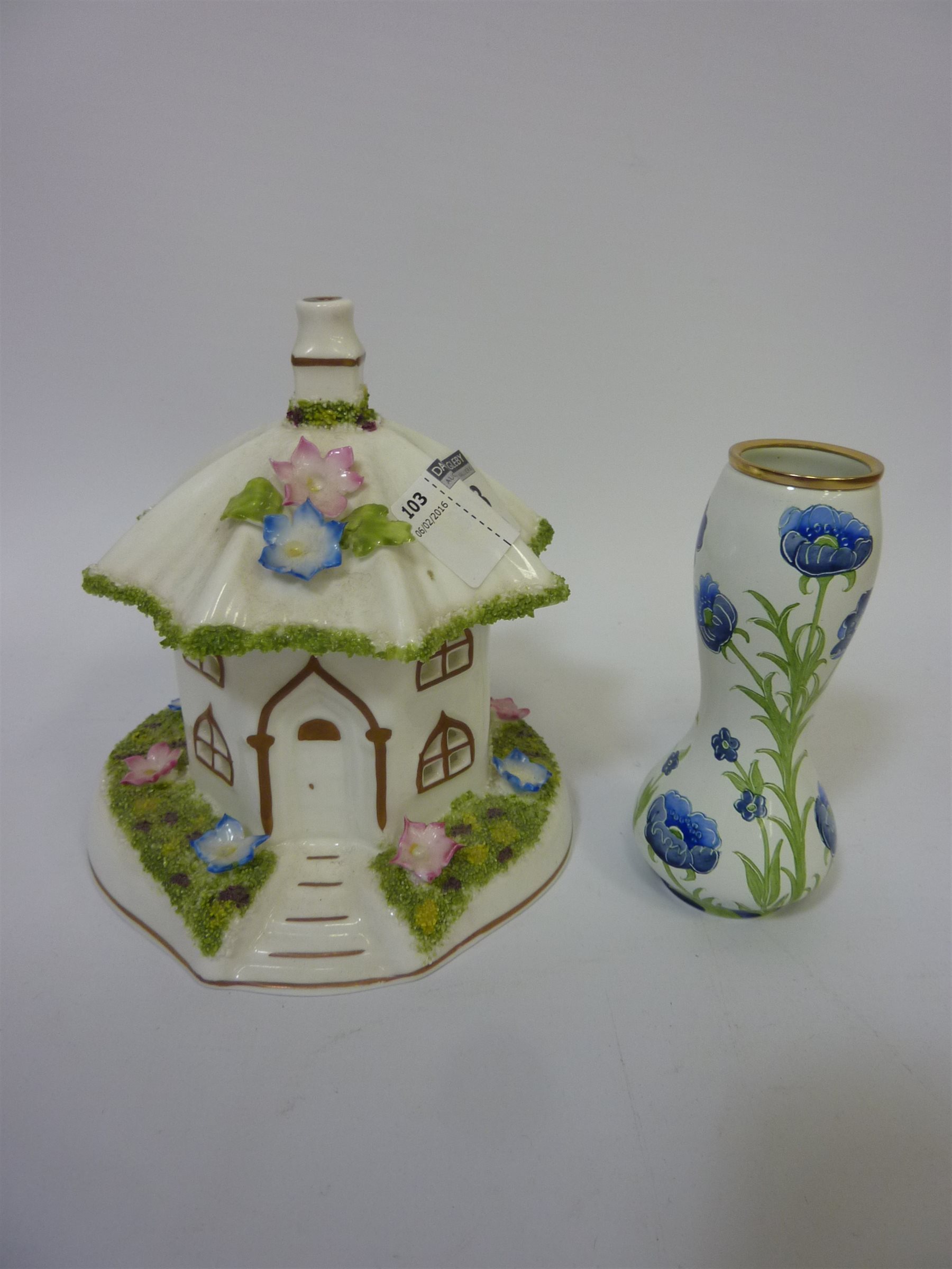 Moorcroft Enamel miniature vase signed E.W. H9.5cm and a Coalport cottage 'The Umbrella House' (2)