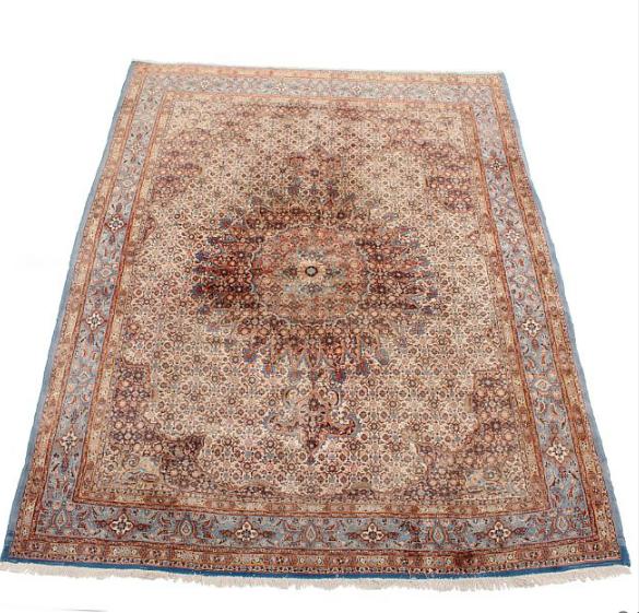 Moud medallion carpet, embellished with ornaments, flowers and foliage on light base