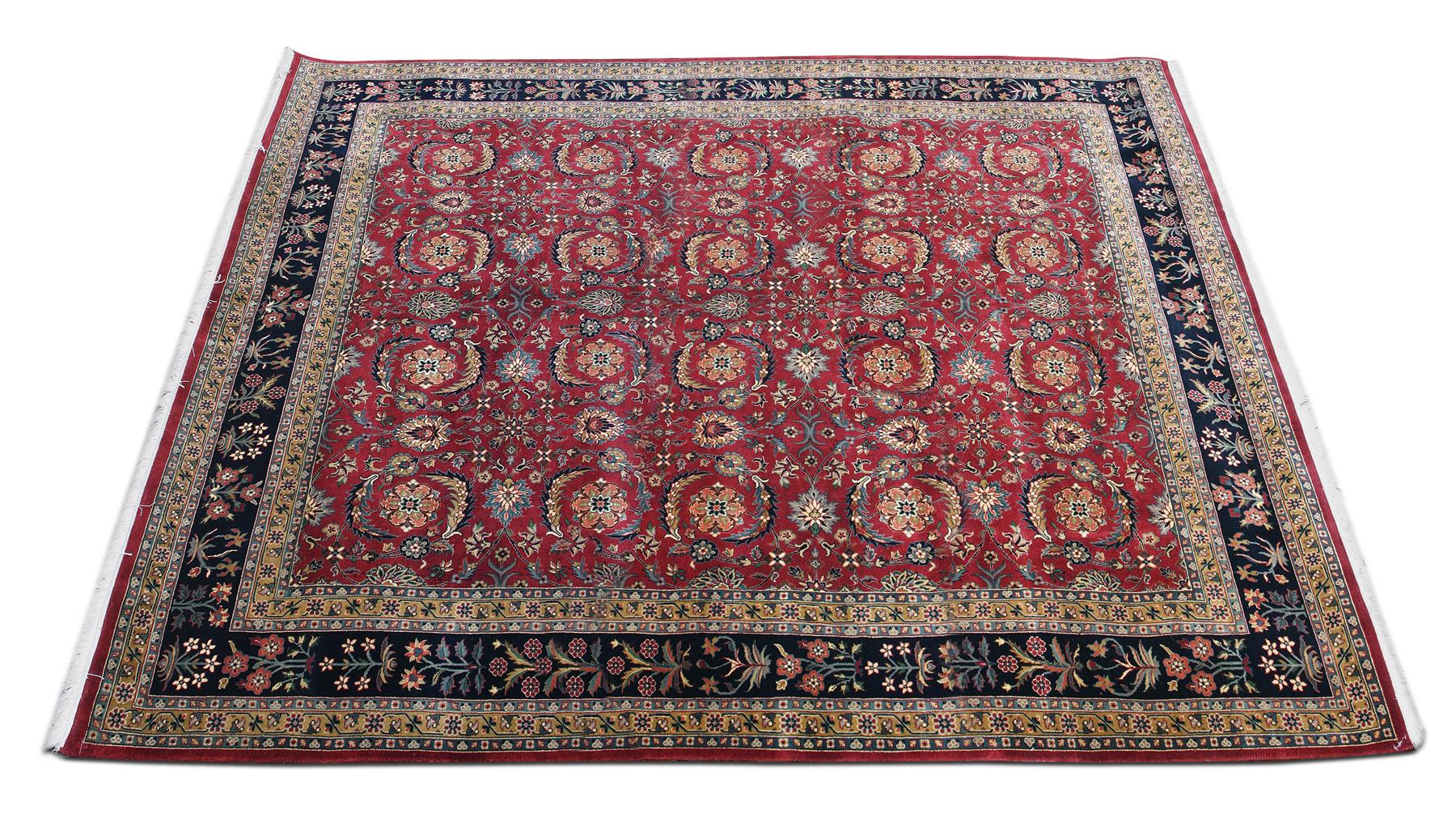 Repeating naturalistic design on a purple ground set within a black border. 8'w. 8'l.