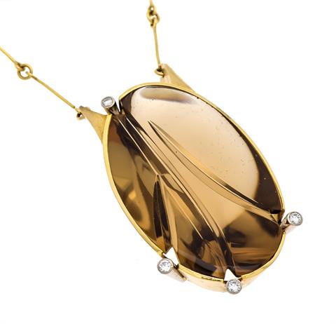 Munsteiner-Citrine-Brillant-Collier GG 750/000 with an oval fine citrine with amber stones, approx. 145 ct in good color, 52 x 33 mm and 4 brilliants, total 0,34 ct white (H) / SI, L. 60 mm, with patent seal, L. 53 cm, 71,8 g, high-quality goldsmith