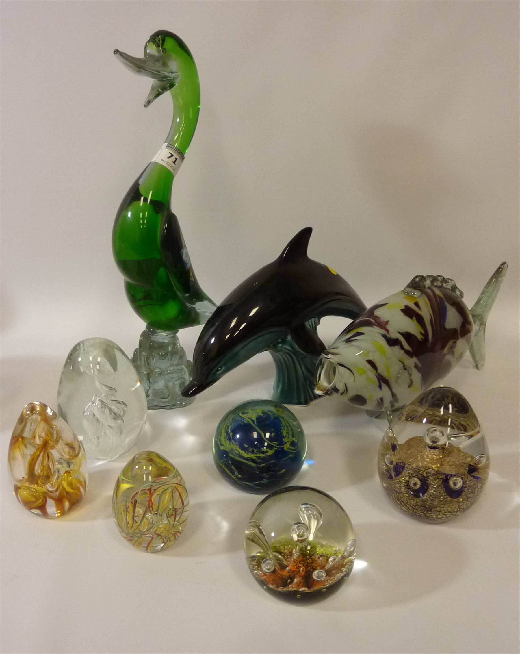 Murano glass duck, fish, Mdina and other coloured glass paperweights and a Poole dolphin