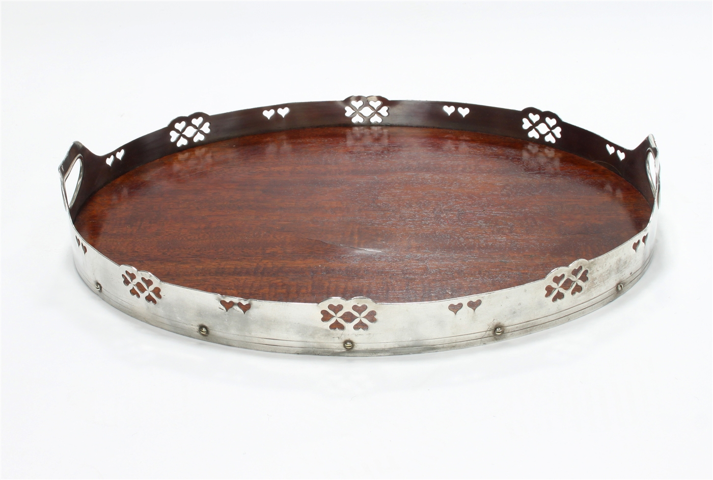 with pierced gallery and twin handles, mahogany base, stamped M.B.Co.