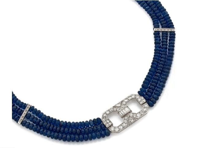 in 14k white gold (585) formed of three falls sapphire billets, intercropping as the central motif in platinum (950), set with brilliant-cut diamonds, the latter framed rectangular strips stapled diamonds Long .: 42 cm , gross weight: 68.66 g At SAP
