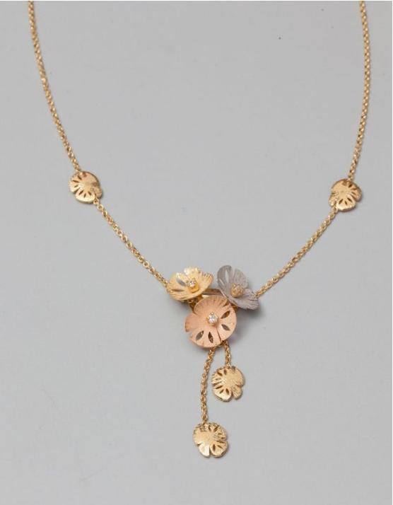 with three gold flowers amati above two pendants flowers, adjustable length, weight: 4,8gr. gross