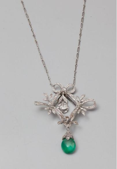 and ribbons around a round diamond pendant weighing 0.60 carat diamond about laying in a corolla, an emerald drop, early twentieth century, weight: 16,8gr . gross