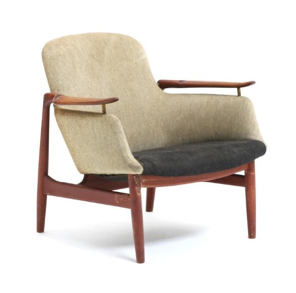 "FJ-53". A teak easy chair with floating armrests, mounted with brass fittings. Seat, sides and back upholstered with grey and brown wool. Designed 1953. Made and stamped by cabinetmaker Niels Vodder. Purchased by the present owner's parents in 1950'