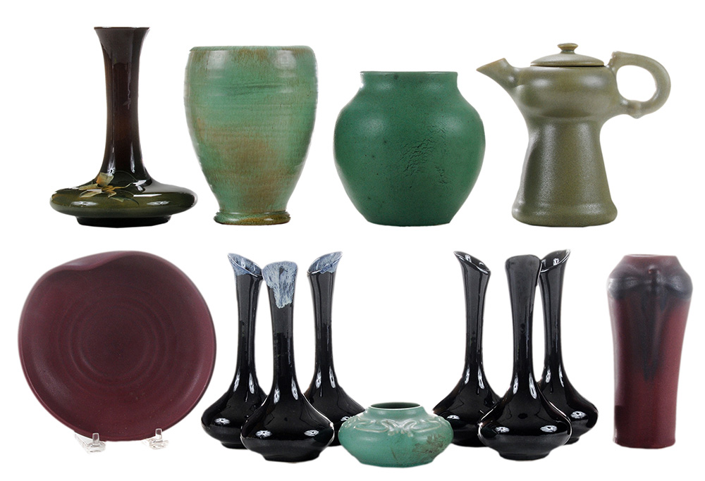 two triple bud vases marked "Van Briggle", one also marked "Colorado Springs" with Van Briggle mark, each 7 in.; maroon vase marked "Van Briggle", 6-5/8 in.; deep lavender shallow dish with concentric circles, pinched rim at one side, "Van Briggle/Co