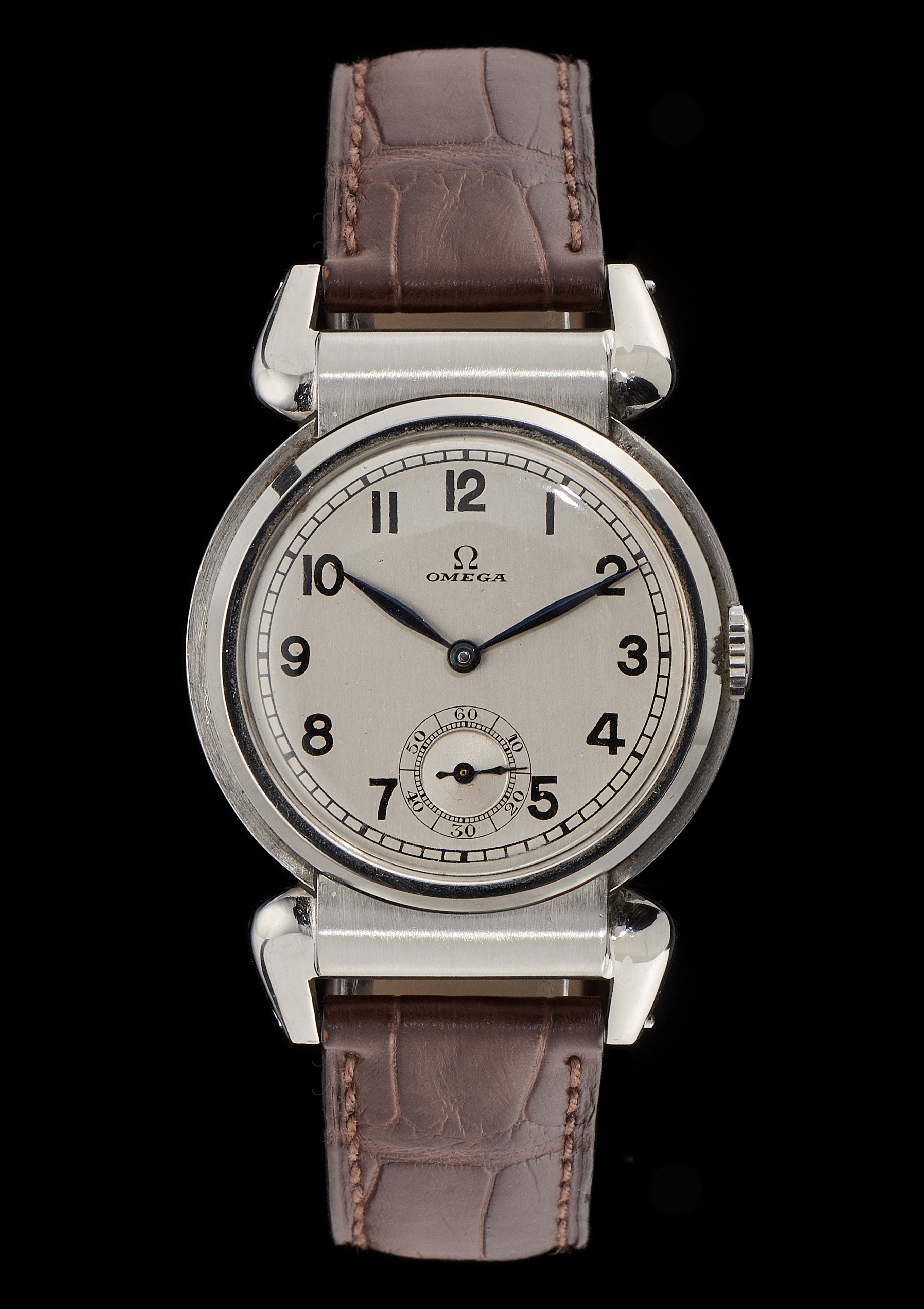Silver dial, black Arabic numerals, blue hands, seconds at 6 o'clock, steel
