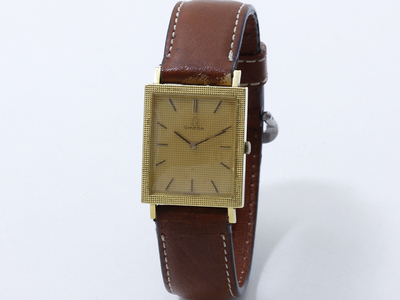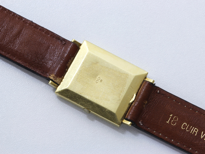 Montre bracelet d'homme en or 750 millièmes, cadran doré avec index bâtons appliqués. Cadran et lunette à décor ''clous de Paris''. Mouvement mécanique signé, numéroté 23424623. Bracelet cuir avec boucle ardillon en acier. Vers 1965/70. (rayures) Po